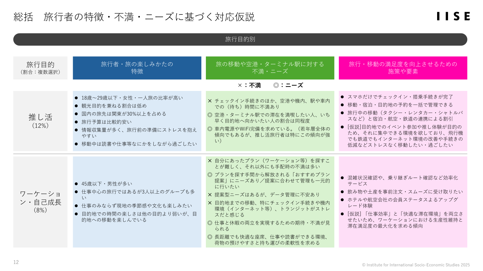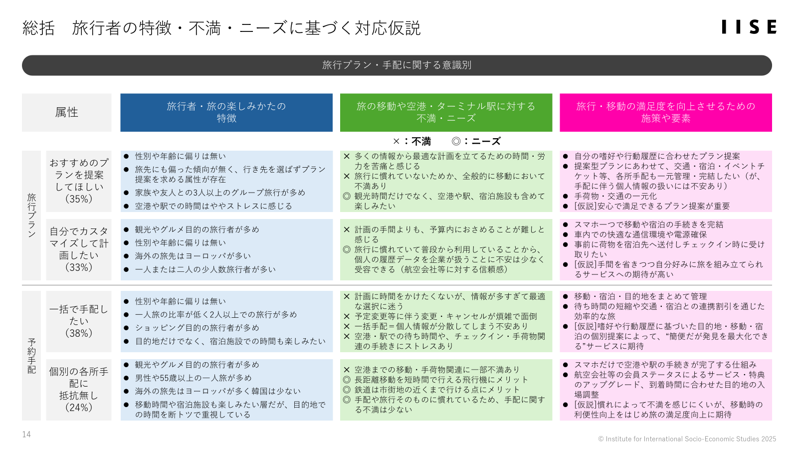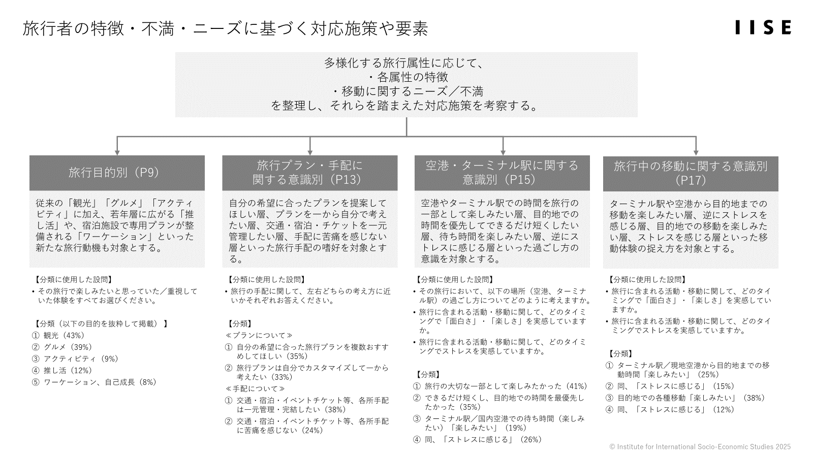 本調査では、多様な旅行者を「旅行目的」「旅マエ」「旅ナカ」の3つの側面から捉え、各属性の特徴、移動に関するニーズ/不満を整理し、それらを踏まえた対応施策を考察しました。