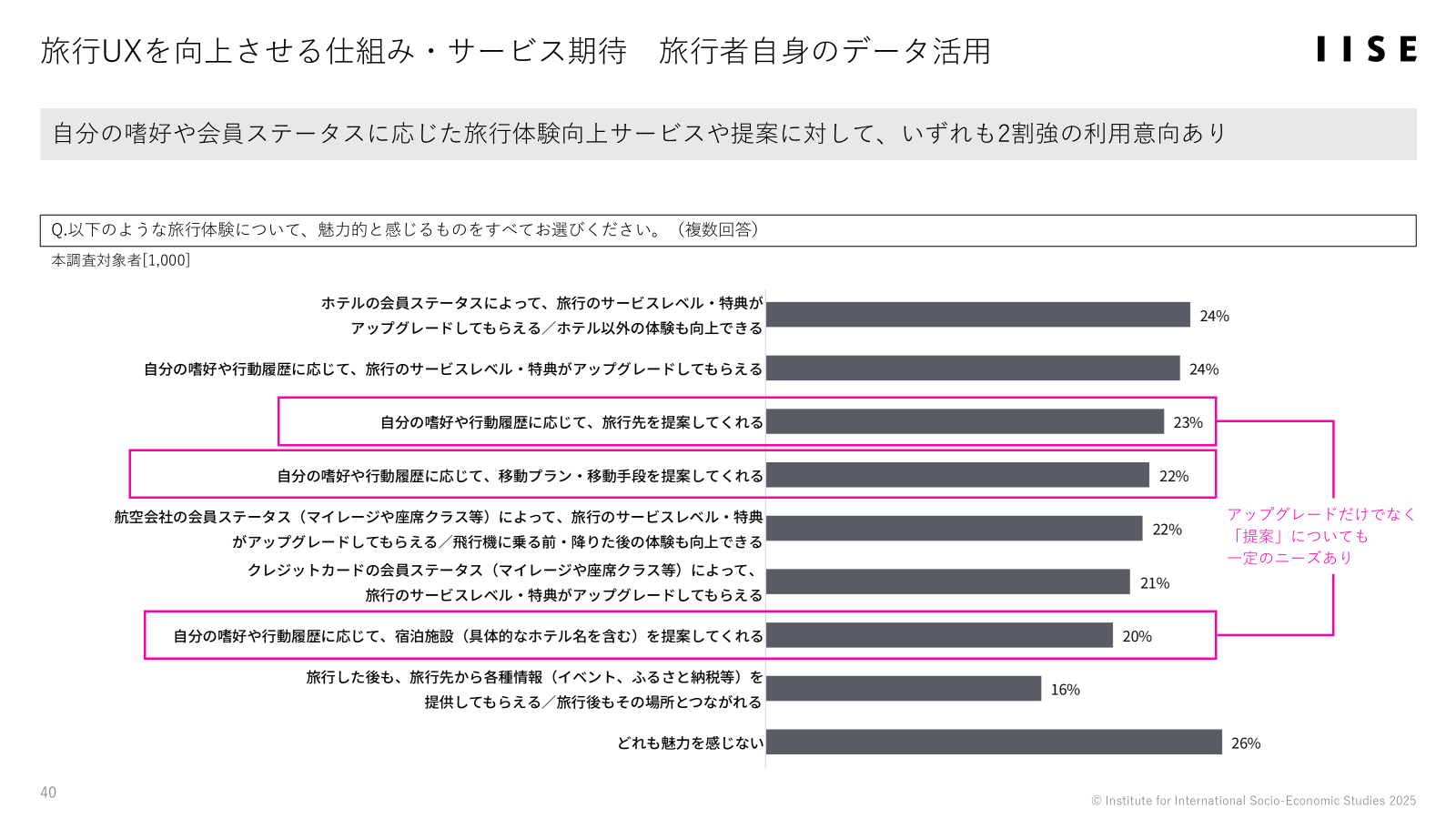 ・会員ステータスや嗜好・行動履歴にもとづく「提案」や「アップグレード」は各々約2割が魅力と回答。嗜好・行動履歴にもとづくパーソナライズ提案(旅行先・移動・宿泊先)のいずれかを魅力と回答した人は全体の4割でした。この「提案」を魅力に感じる層は、不満やサービス向上施策への関心も高く、旅行全般への意欲の高さがうかがえます。