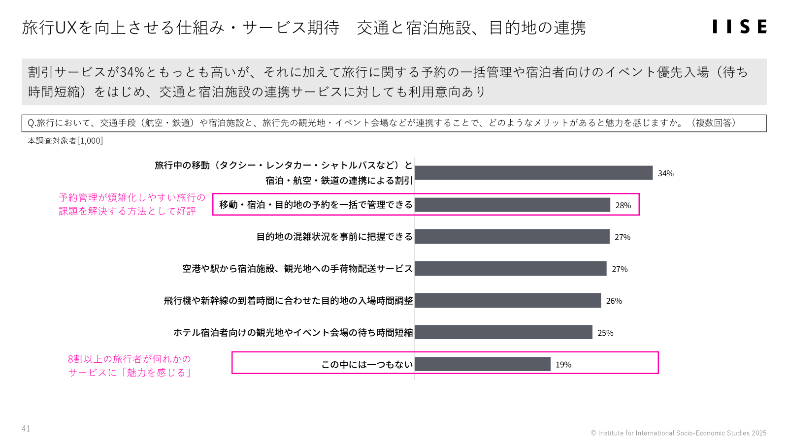 ・交通・宿泊地・目的地がデータ連携することで実現するサービスでは、「割引」34%「移動・宿泊・目的地の予約一括管理」29%「事前の混雑把握」27%が上位、8割がいずれかのサービスに魅力を感じると回答。個別の場の改善よりも、データ連携によって旅全体の体験を向上させる取り組みへのニーズがありそうです。